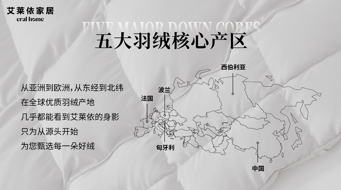 一床好被,始于源头。艾莱依深谙此道,坚持从全球优质羽绒产地直接选材,将宝藏级的温暖带回中国。从亚洲水秀山明的洁净水域,到欧洲绿色生态的天然牧场,从东经的悠长海岸到北纬的辽阔平原——在世界羽绒的黄金产区,几乎都能见到艾莱依寻绒人的身影。这份对原料的执着,是对品质的承诺,更是对每一位使用者睡眠健康的尊重。
