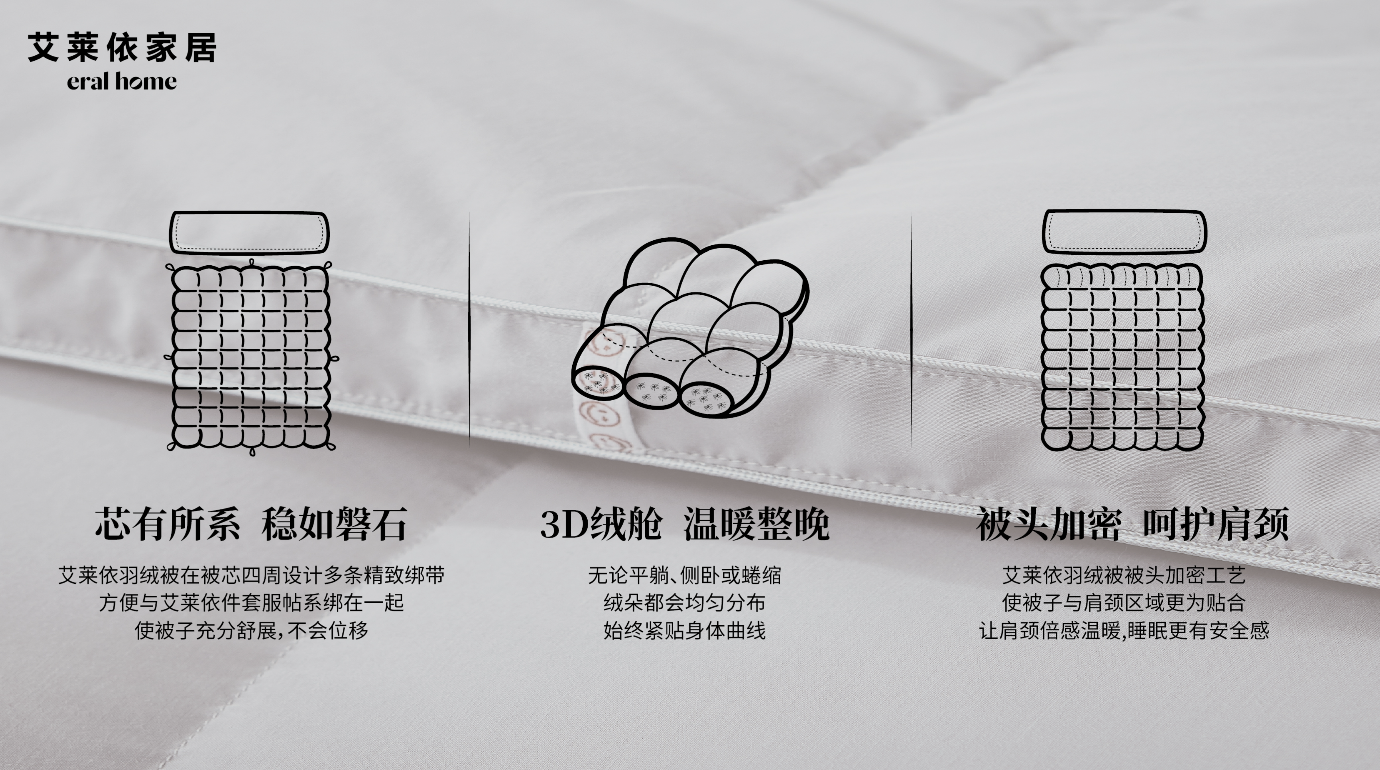 温暖之上,更藏匠心。艾莱依羽绒被的细节设计中,蕴藏着对睡眠体验的深刻理解:四周固位工艺,通过贴心绑带将被芯与件套牢牢贴合,翻身不易移位,守护整夜整洁;被头加密工艺,特别加厚肩颈覆盖区域,防止夜间漏风受寒,贴心如拥抱;3D立体绒舱设计,让每一朵绒都能自由舒展,形成均匀保暖的空气层,告别冷点,温暖遍布全身。这些不起眼的“小设计”,正是安睡到天明的“大保障”。